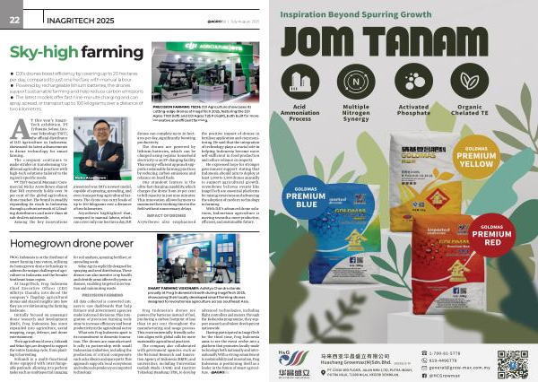 AT this year’ s Inagri- Tech exhibition, PT Tribuana Solusi Inovasi Teknologi( TSIT), the official distributor of DJI Agriculture in Indonesia, showcased its latest advancements in drone technology for smart farming.