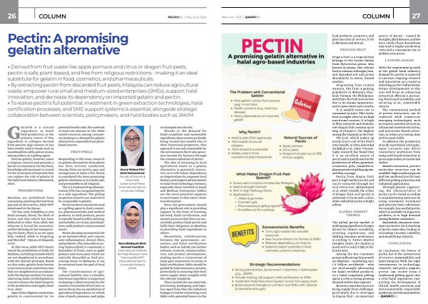 In conclusion, the future of pectin lies at the intersection of science, sustainability and halal integrity. With the right investments in technology, research, and policy support, pectin can evolve from a traditional gelling agent into a vital halal ingredient, supporting the development of ethical, health-conscious, and environmentally responsible products across various industries.- @ AGROBiz