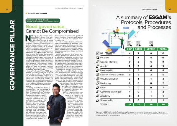 Justice Datuk Seri Hasnah Mohammed Hashim, the current Chief Judge of Malaya, underscored the uncompromising nature of ethical governance in the 2018 Court of Appeal case Menteri Besar Selangor( Pemerbadanan) v Faekah bt Hj Hussin & Ors. Her Ladyship firmly stated:“ We are of the view that accountability, transparency and good governance cannot, in any manner, no matter how urgent it may be, be compromised.” Sound governance is not merely aspirational but a foundational duty that must be upheld at all times. As ESG continues to shape the future of corporate Malaysia, it is important to recognise that good governance must come first, as governance forms the backbone upon which the Environmental and Social pillars are built. A journey of a thousand miles begins with a single step. Embarking on the ESG journey might not be easy, but it is definitely doable and worth pursuing.