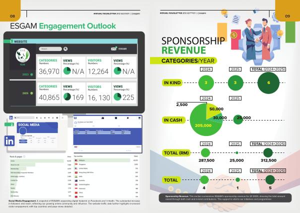 Social Media Engagement: A snapshot of ESGAM ' s expanding digital footprint on Facebook and LinkedIn. The substantial increase in followers and reach, reflecting our growing online community and influence. The website traffic data further highlights increased visitor engagement, with top countries and page views detailed.