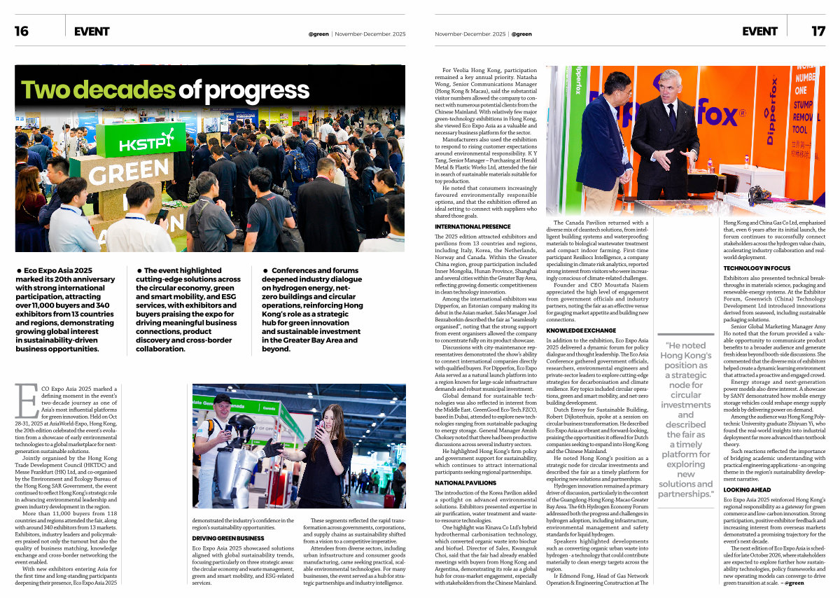 ECO Expo Asia 2025 marked a defining moment in the event’ s two-decade journey as one of Asia’ s most influential platforms for green innovation. Held on Oct 28-31, 2025 at AsiaWorld-Expo, Hong Kong, the 20th edition celebrated the event’ s evolution from a showcase of early environmental technologies to a global marketplace for nextgeneration sustainable solutions.
