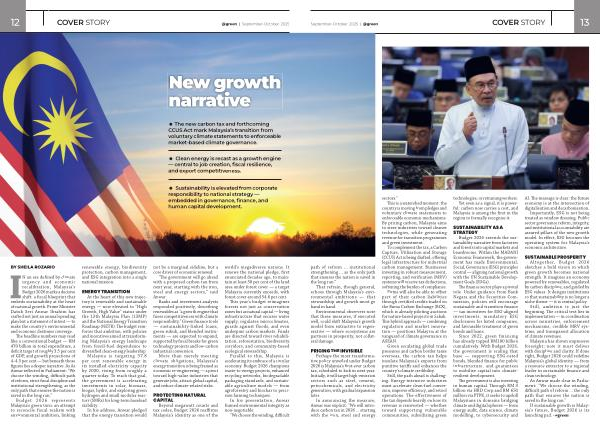 |  BY SHEILA ROZARIO IN an era defined by climate urgency and economic recalibration, Malaysia’ s Budget 2026 marks a decisive shift: a fiscal blueprint that embeds sustainability at the heart of national growth. Prime Minister Datuk Seri Anwar Ibrahim has crafted not just an annual spending plan but a statement of intent— to make the country’ s environmental and economic destinies converge. The headline numbers may read like a conventional budget— RM 470 billion in total expenditure, a deficit target of roughly 3.5 per cent of GDP, and growth projections of 4 – 4.5 per cent— but beneath those figures lies a deeper narrative. As As Anwar reflected in Parliament:“ We choose the winding, difficult path of reform, strict fiscal discipline and institutional strengthening, as the only path that ensures the nation is saved in the long run.”  Budget 2026 represents Malaysia’ s green turn: an attempt to reconcile fiscal realism with environmental ambition, linking |  renewable energy, biodiversity protection, carbon management, and ESG integration into a single national mission.  ENERGY TRANSITION  At the heart of this new trajectory is renewable and sustainable energy— now elevated to“ High Growth, High Value” status under the 13th Malaysia Plan( 13MP) and the National Energy Transition Roadmap( NETR). The budget reinforces that ambition, with policies and incentives aimed at transforming Malaysia’ s energy landscape from fossil-fuel dependence to diversified clean-energy leadership.  Malaysia is targeting 37.8 per cent renewable energy in its installed electricity capacity by 2030, rising from roughly a quarter today. To reach that goal, the government is accelerating investments in solar, biomass, biogas, hydro, and exploring green hydrogen and small modular reactors( SMRs) for long-term baseload stability.  In his address, Anwar pledged that the energy transition would |  not be a marginal sideline, but a core driver of economic renewal: “ The government will go ahead with a proposed carbon tax from next year, starting with the iron, steel and energy sectors,” said Anwar.  Banks and investment analysts responded positively, describing renewables as“ a growth engine that fuses competitiveness with climate responsibility.” Green finance tools— sustainability-linked loans, green sukuk, and blended instruments— are expected to expand, supported by fiscal breaks for green technology projects and low-carbon industrial conversion.  More than merely meeting climate obligations, Malaysia’ s energy transition is being framed as economic re-engineering— a pivot toward high-value industries that generate jobs, attract global capital, and reduce climate-related risks.  PROTECTING NATURAL CAPITAL  Beyond megawatt counts and tax codes, Budget 2026 reaffirms Malaysia’ s identity as one of the |  world’ s megadiverse nations. It renews the national pledge, first enunciated decades ago, to maintain at least 50 per cent of the land area under forest cover— a target Malaysia currently exceeds, with forest cover around 54.6 per cent.  This year’ s budget reimagines forests not just as conservation zones but as natural capital— living infrastructure that secures water supply, regulates microclimates, guards against floods, and even underpins carbon markets. Funds are directed toward river rehabilitation, reforestation, biodiversity corridors, and community-based ecological stewardship.  Parallel to this, Malaysia is accelerating its embrace of a circular economy. Budget 2026 champions waste-to-energy projects, enhanced recycling networks, biodegradable packaging standards, and sustainable agriculture models— from agroforestry and biochar to precision farming techniques.  In his presentation, Anwar framed environmental integrity as non-negotiable: “ We choose the winding, difficult |