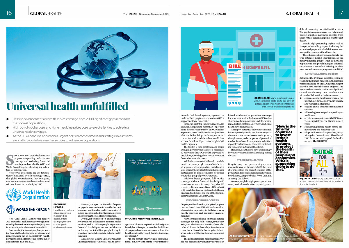 Achieving the UHC goal by 2030 is central to realising the human right to health. With five years remaining on the SDG agenda, urgent action is now needed to drive progress. The report underscores the critical role of political commitment in every country and community, and calls for action in six core areas: ensure essential health care is free at the point of care for people living in poverty and vulnerable situations; expand public investments in health systems; address high out-of-pocket spending on medicines; accelerate access to essential NCD services, especially as the disease burden rises; strengthen primary health care to promote equity and efficiency; and adopt multisectoral approaches, recognising that determinants of health and UHC drivers extend beyond the health sector.- The HEALTH